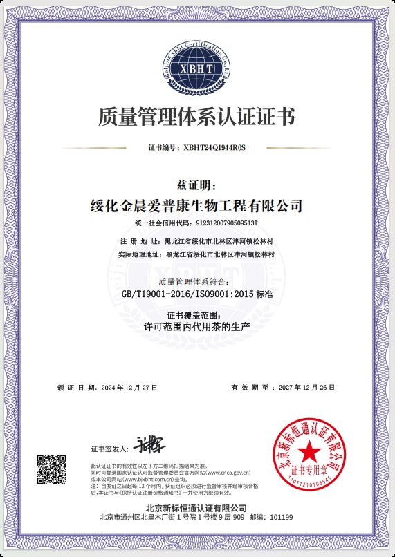 绥化金晨爱普康生物工程有限公司位于黑龙江省中南部地区的绥化市北林区,所处位置东经124度,北纬45度,位于松嫩平原的呼兰河流域,“有寒地黑土,塞北江南”的美誉,是全国重要的商品粮基地,属中温带大陆性季风气候,四季分明,雨热同期,冬季冰雪覆盖,夏季降雨集中气候温热湿润。绥化金晨爱普康生物工程有限公司是一家专业从事健康养生产品研发、生产及销售企业,公司占地总面积8000平方米,建筑面积5000平方米,公司周围无任何污染源,是食品生产基地。公司生产车间洁净度级别达到10万级,同时拥有数十台先进的生产设备及高科技检验仪器,从产品的原辅料、中间品、成品到销售的全过程严格把关,使生产中每道工序都符合产品的高标准要求,从而保证了公司生产的每一袋产品合格,无质量缺陷。绥化金晨爱普康生物工程有限公司率先采用了企业资源ERP管理系统,肩负着养生产业的重要课题,同时又是江苏省国家药用植物重点实验中心科研成果转化的生产试验基地,公司核心成员均为本科以上学历。生产的产品有近五十个品种的代用茶产品,公司先后通过HALAL国际认证,编号为SSPY-201318-33849;ISO9001质量管理体系认证编号为XBH···